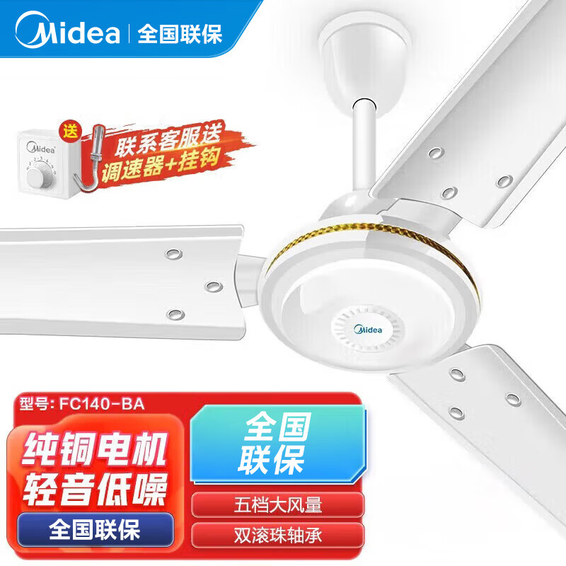 美的(Midea) 吊扇家用客厅电风扇轻音钢叶大风力宿舍工厂楼顶扇吸顶风扇 风扇踏青放价 白色 FC140-BA(56寸/1.4米)