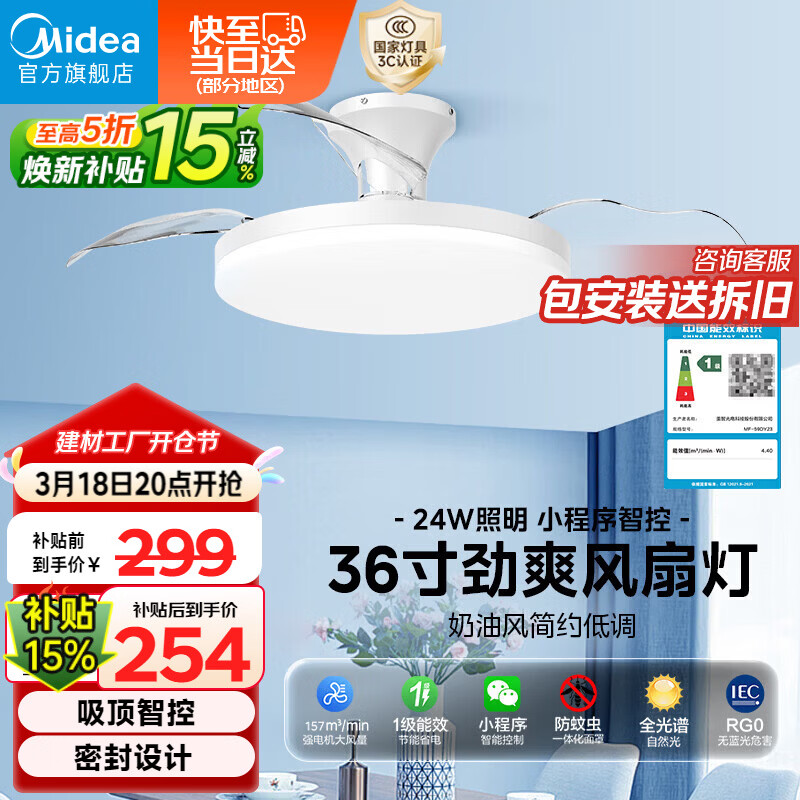 美的(Midea)吊扇灯一体风扇灯餐厅客厅卧室led隐形扇护眼36w灯具熟睡风包安装