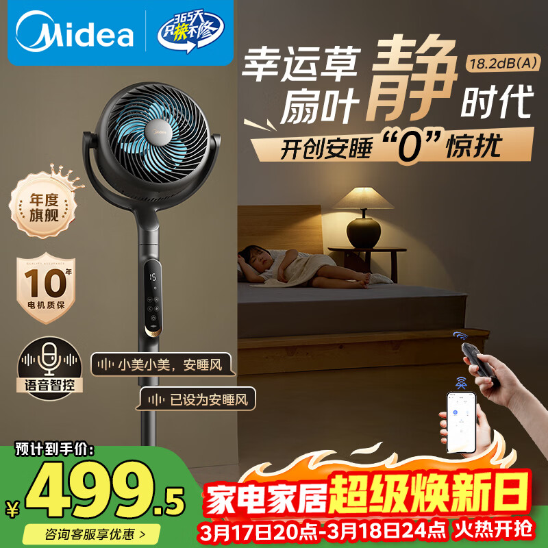 美的(Midea)【幸运草安睡Ultra】直流变频3D摇头空气循环扇/卧室静音家用电风扇/小型遥控落地扇/语音净化风扇