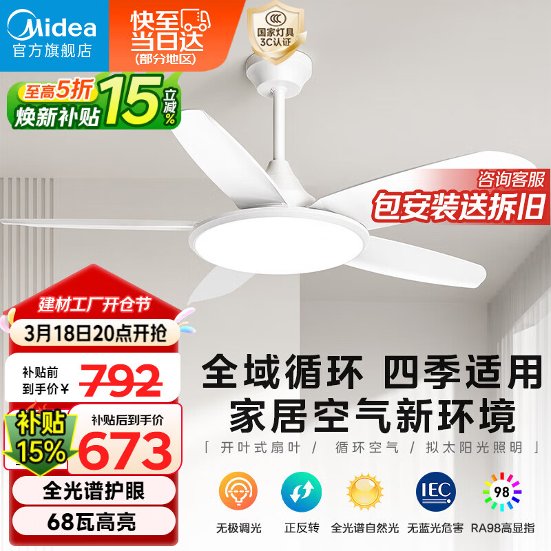 美的(Midea)风扇灯护眼LED餐厅卧室遥控调光一体客厅灯饰42寸熟睡风包安装