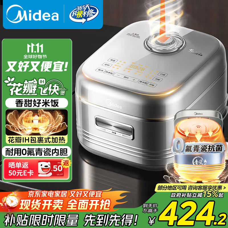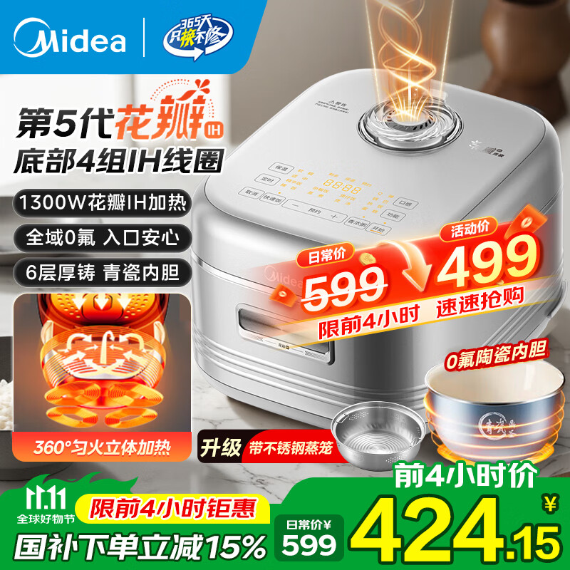 美的花瓣IH立体加热电饭煲电饭锅2-3-4-5-6人用 0氟陶瓷内胆一级抗菌 家用小米粥快速饭柴火饭电煮饭煲 【1300w花瓣IH加热】25年新款0氟青瓷 4L