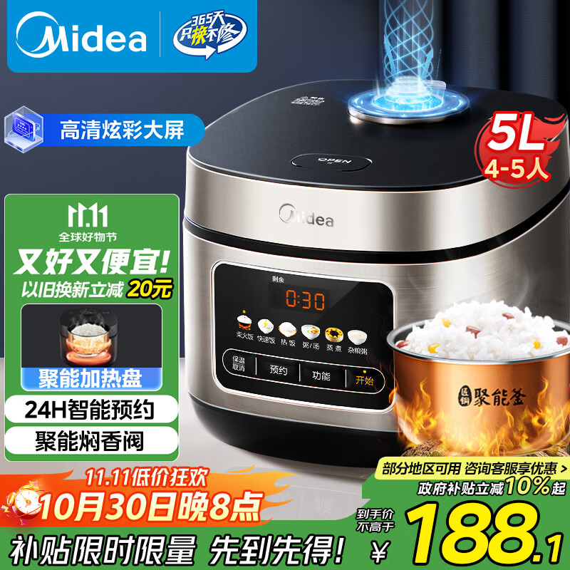 美的(Midea)政府补贴 电饭煲电饭锅4-5人家用5升大容量 炫彩大屏金属机身大火力煮饭锅智能预约微压MB-RE517