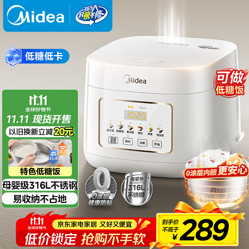 美的(Midea)政府补贴 低糖电饭煲电饭锅0涂层3升2-3人无涂层316L不锈钢内胆一键柴火饭家用多功能MB-3E91LS