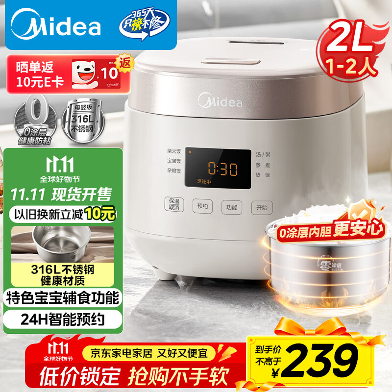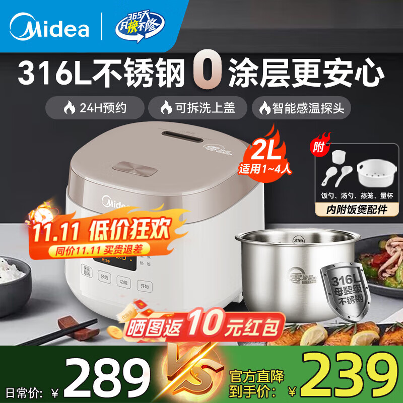 美的电饭煲1-2-3人 家用0涂层316L不锈钢内胆电饭锅小型 迷你智能多功能定时煮小米粥锅微压 母婴级【上盖可拆洗】白 2L