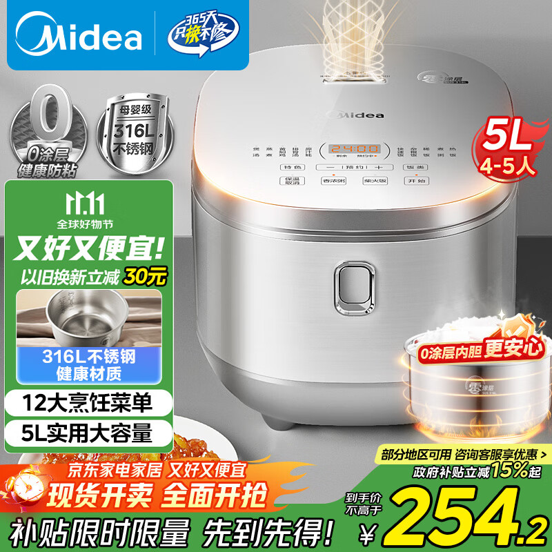 美的(Midea)政府补贴 电饭煲0涂层电饭锅5L大容量316L不锈钢内胆4-5人无涂层家用多功能微压电饭煲MB-RE576S