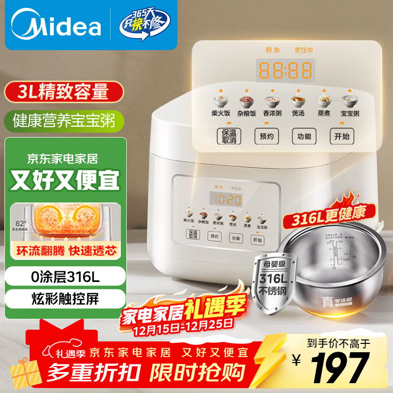 美的(Midea)电饭煲 3L家用电饭锅 316L不锈钢内胆无涂层煮饭锅 2-3人多功能0涂层煲汤煮粥锅米饭锅MB-RE387S