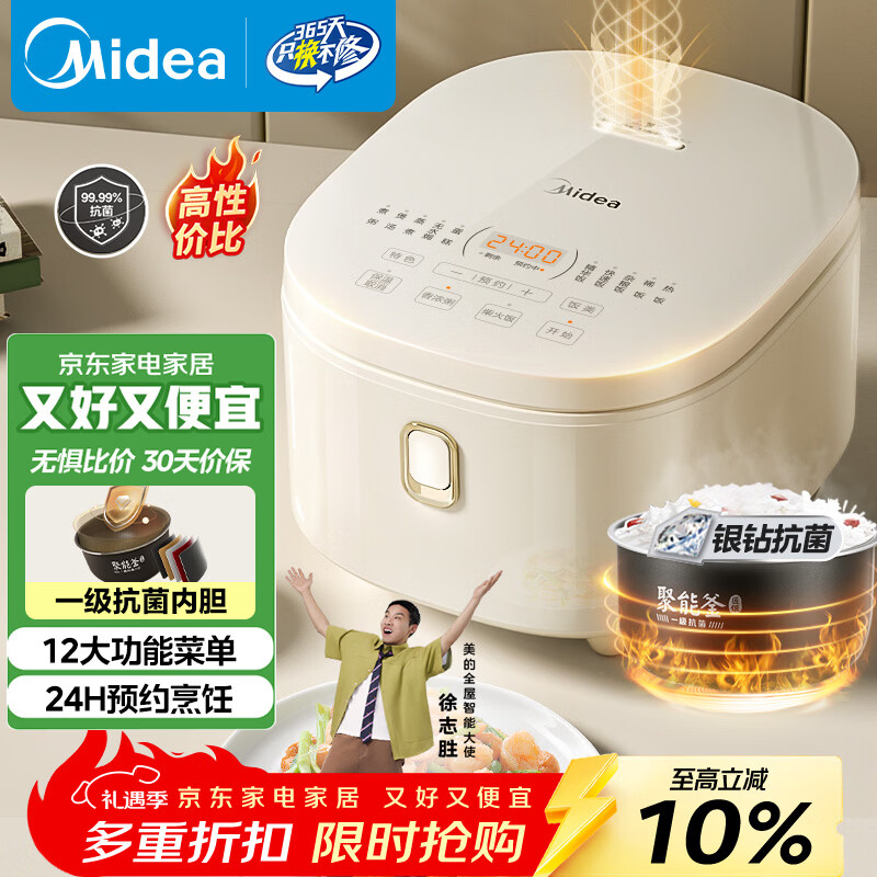 美的(Midea)电饭煲4L电饭锅抗菌青瓷内胆特色卤炖一键柴火饭多功能微压家用3-4人智能预约MB-4E86