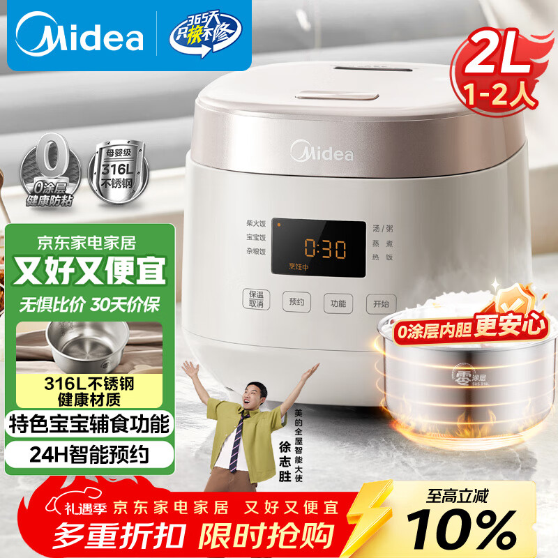 美的(Midea)电饭煲0涂层2L不锈钢内胆1-2人电饭煲电饭锅 家用智能多功能微压无涂层电饭煲MB-RC201S