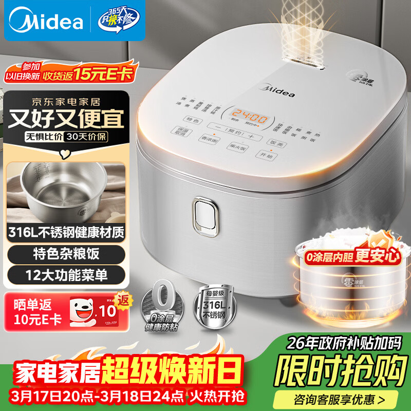 美的(Midea)电饭煲 0涂层电饭锅4升 316L不锈钢内胆3-4人家用多功能无涂层微压智能预约MB-RE476S