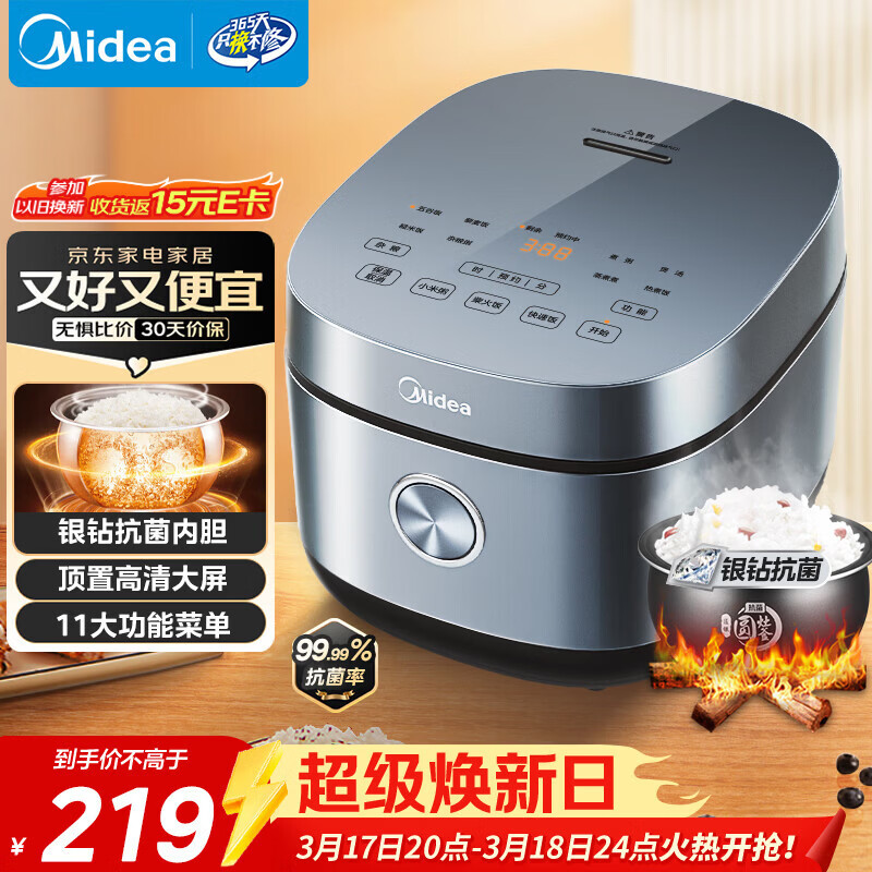 美的(Midea)电饭煲电饭锅4L银钻内胆11大菜单家用智能多功能电饭煲大火力米饭锅MB-RE473(3-4人)