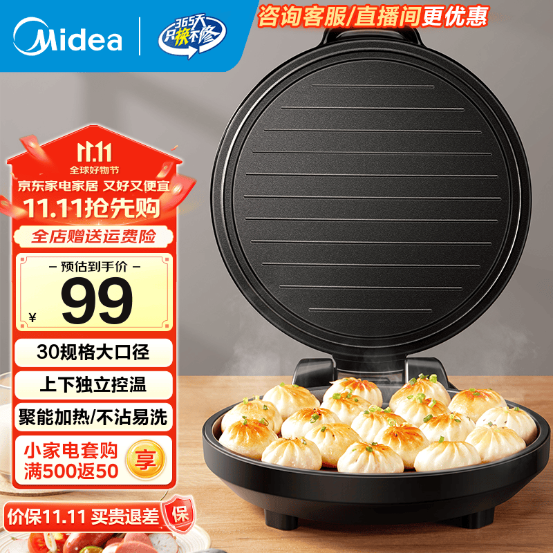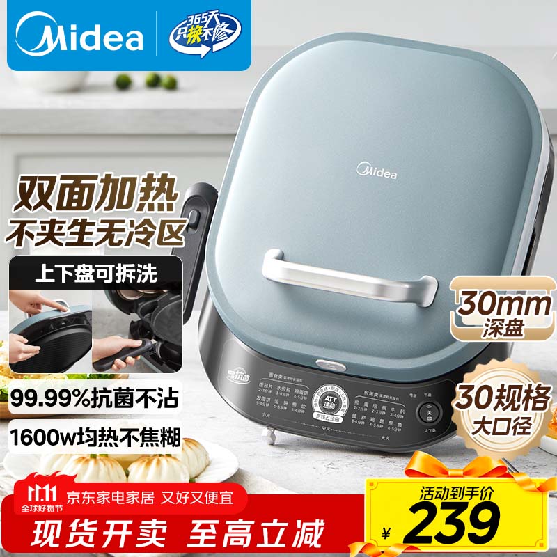 美的(Midea)电饼铛 家用电饼铛 早餐机 大尺寸悬浮加深烤盘煎烤机多功能烙饼锅煎饼锅 【180°开合设计丨上下独立加热】JHN30F