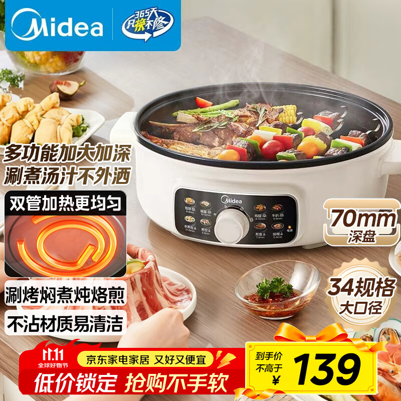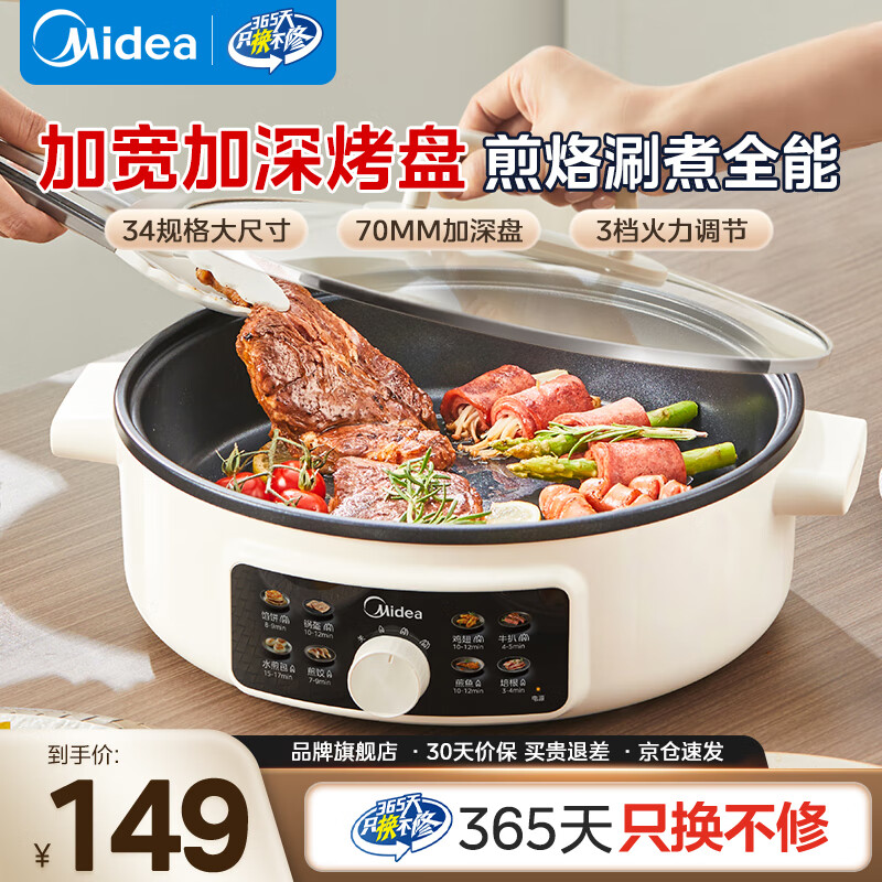 美的(Midea)家用电饼铛烙饼锅 三明治机早餐煎烤机电火锅 电炒锅烤肉锅 70mm加深 多功能锅 抗菌电煎锅JKC3463