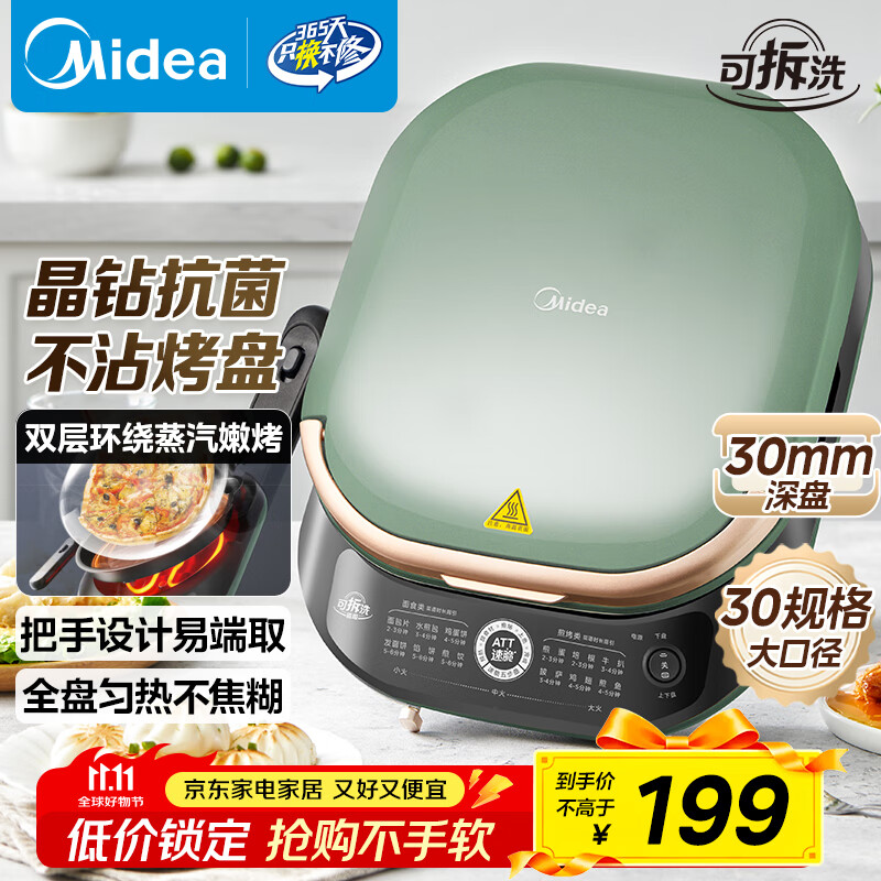 美的(Midea)电饼铛家用 电饼档 双面加热煎饼烙饼锅 煎烤机早餐机三明治 30CM大尺寸加大加深电煎烤肉锅JHN30F