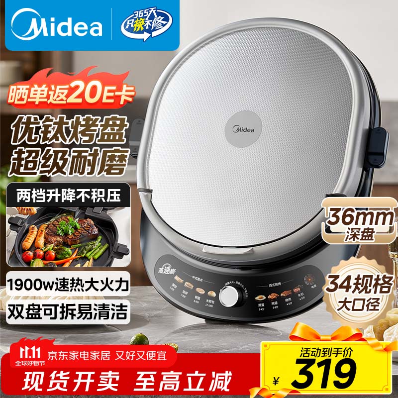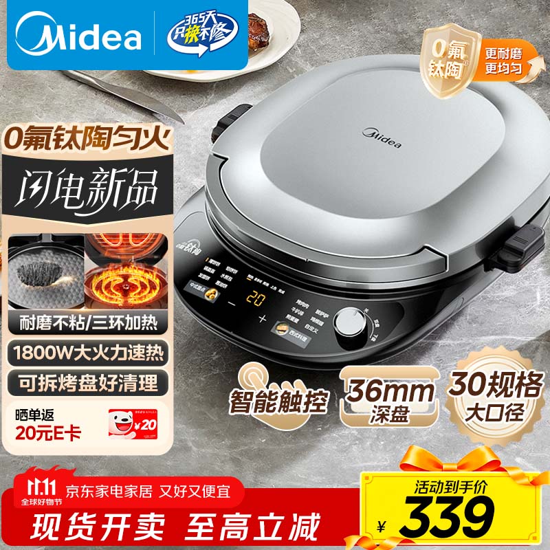 美的(Midea)电饼铛家用 下可拆洗双面加热加深大火力40mm加深34cm烙饼煎饼锅三明治早餐机煎烤机电饼档JKE3483