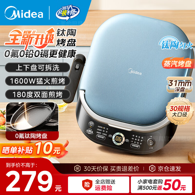 美的(Midea)电饼铛家庭用上下盘可拆洗蒸汽烤盘家用双面加热加深加大烙饼煎饼锅三明治早餐机电煎锅烤肉电烤盘 【上下双盘可拆洗丨31mm加深盘】JKC3078