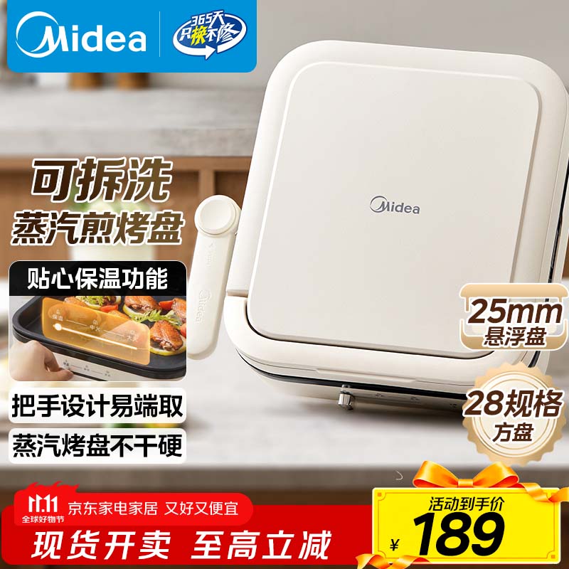 美的(Midea)电饼铛家用下盘可拆洗大火力三明治早餐机煎烤锅 方形双面加热加深大尺寸升级蒸汽烙饼烤肉锅28J51