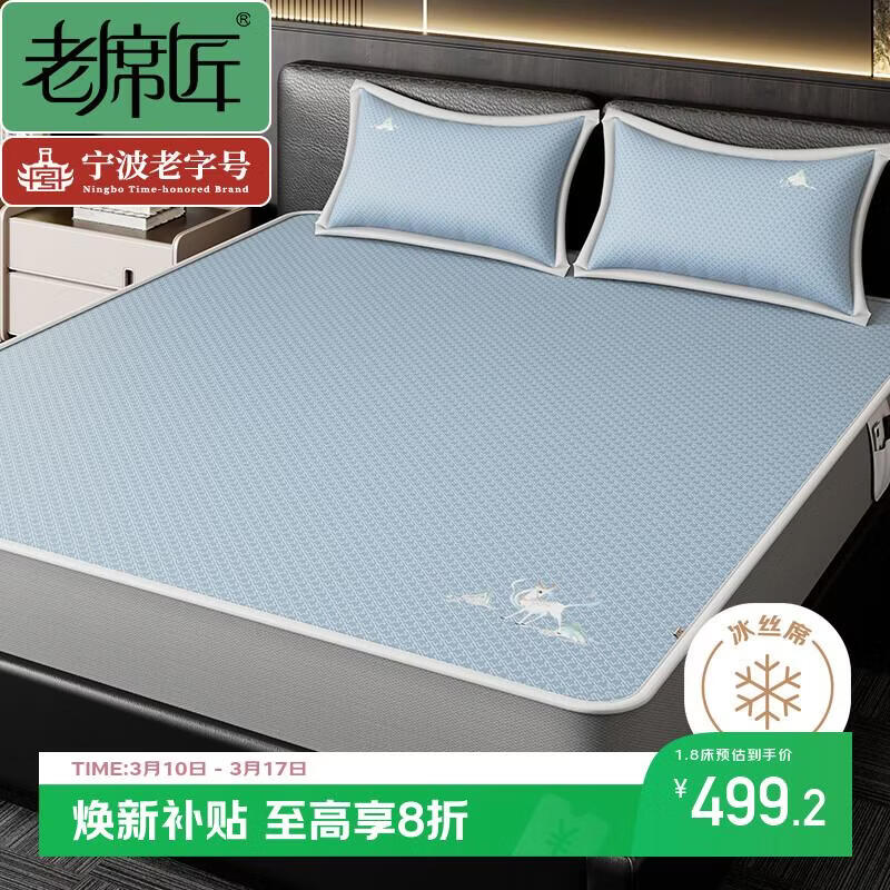 老席匠冰丝凉席母婴级A类1.5米1.8米三件套加厚水洗机洗夏季空调凉席子 逸冷冰肤-床席款-福鹿-7A抗菌 三件套 1.8米床 180cm*200cm