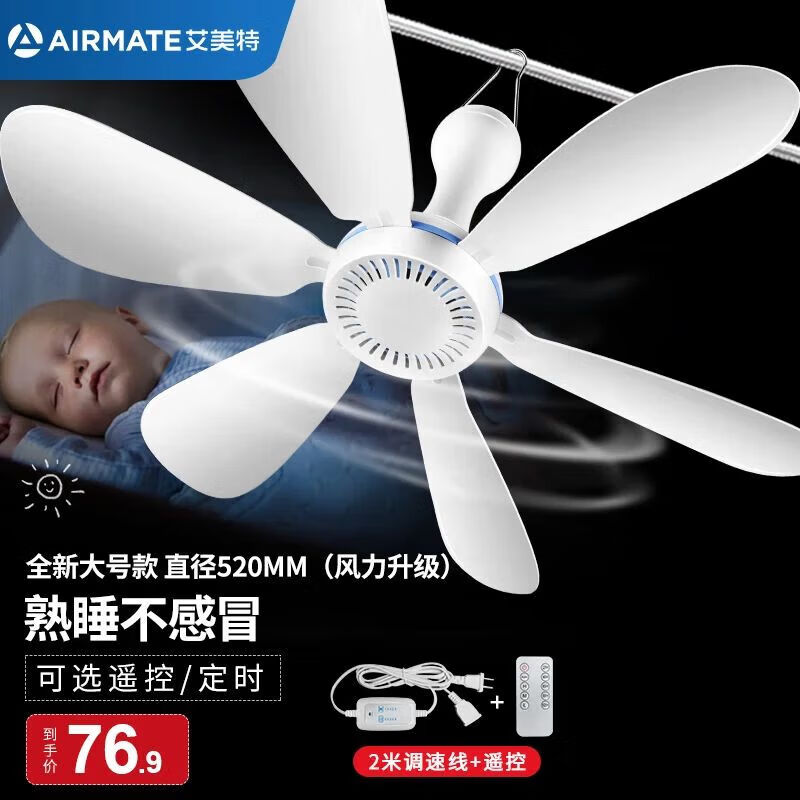 艾美特(AIRMATE)小吊扇学生宿舍床上电风扇大风力小风扇蚊帐扇微风吊扇电扇 标准款+2米调速线+遥控 标准款