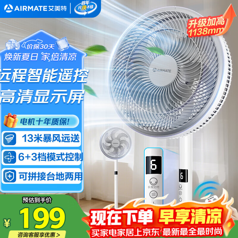 艾美特(AIRMATE)【智能遥控】七叶家用大风量落地扇电风扇台式空气循环小风扇6档暴风定时电扇高清屏显 FS30-R99