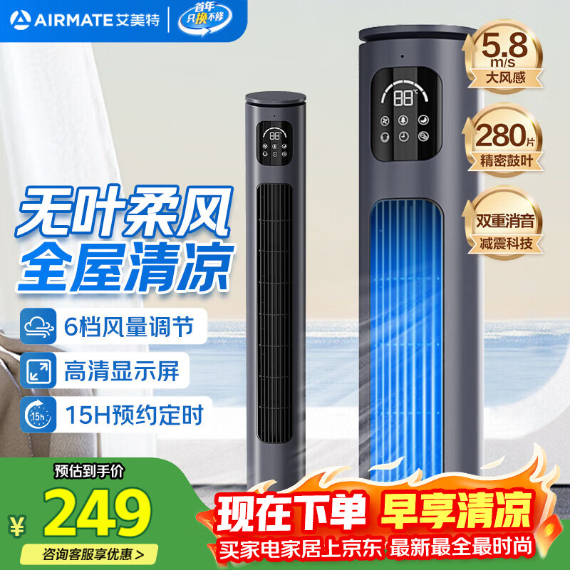 艾美特(AIRMATE)无叶柔风遥控塔扇6档大风口自然风电风扇家用台式空气循环小风扇摇头无叶扇轻音落地定时电扇 R18