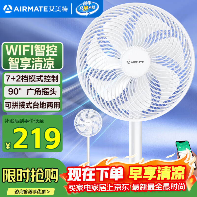 艾美特(AIRMATE)京东小家电风扇智能七叶柔风落地扇小风扇家用7档大风量节能轻音电扇桌面台式小型风扇 FS30-AR62