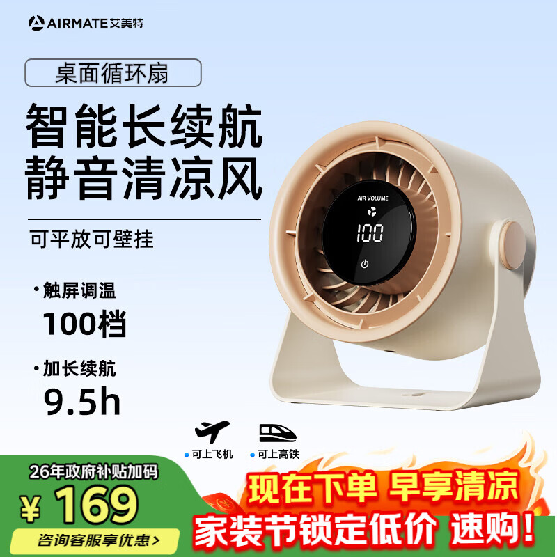 艾美特(AIRMATE)小风扇电风扇桌面小型风扇100档空气循环扇台壁两用充电迷你小风炮轻音节能长续航电扇 AH33