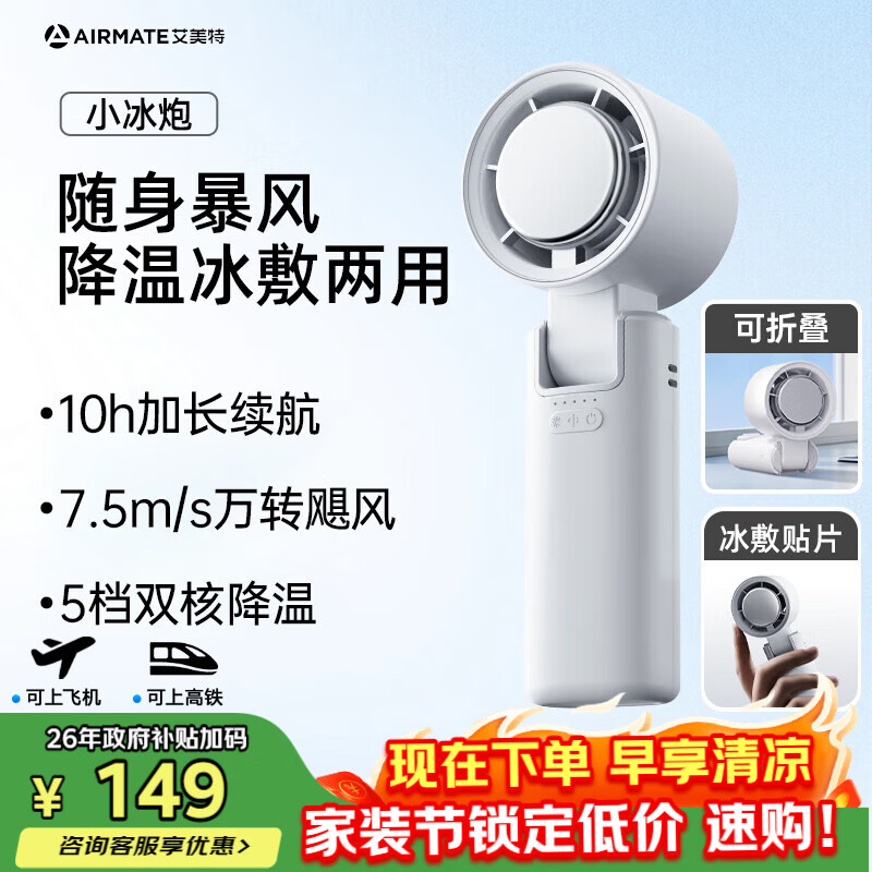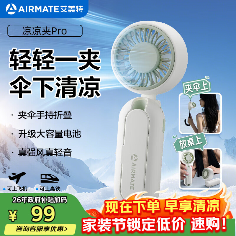 艾美特(AIRMATE)小风扇伞夹手持风扇小风炮便携式折叠充电迷你小型长续航户外轻音节能电风扇开学季军训宿舍