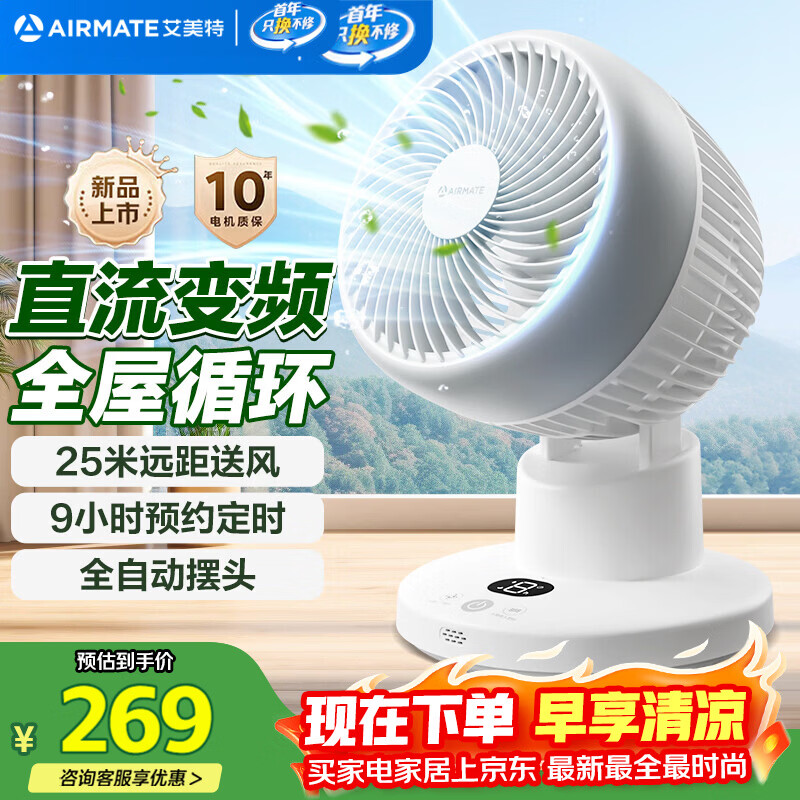 艾美特(AIRMATE)空气循环扇家用直流轻音节能电风扇桌面台式小风扇大风量便携宿舍摇头风扇换气风扇 FA15-RD251