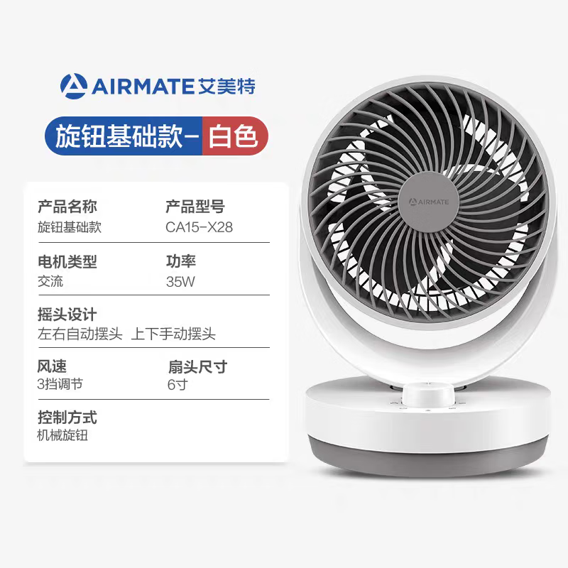 艾美特电风扇家用循环扇涡轮对流风扇遥控办公室桌面迷你台扇 白色机械款6吋