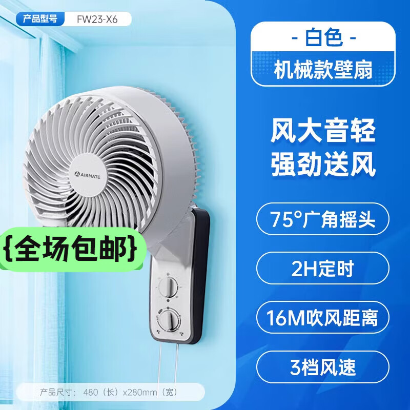 艾美特电风扇家用空气循环扇壁挂式电扇商用厨房摇头大风力壁扇R7 白色旋钮款壁扇FW23-X6