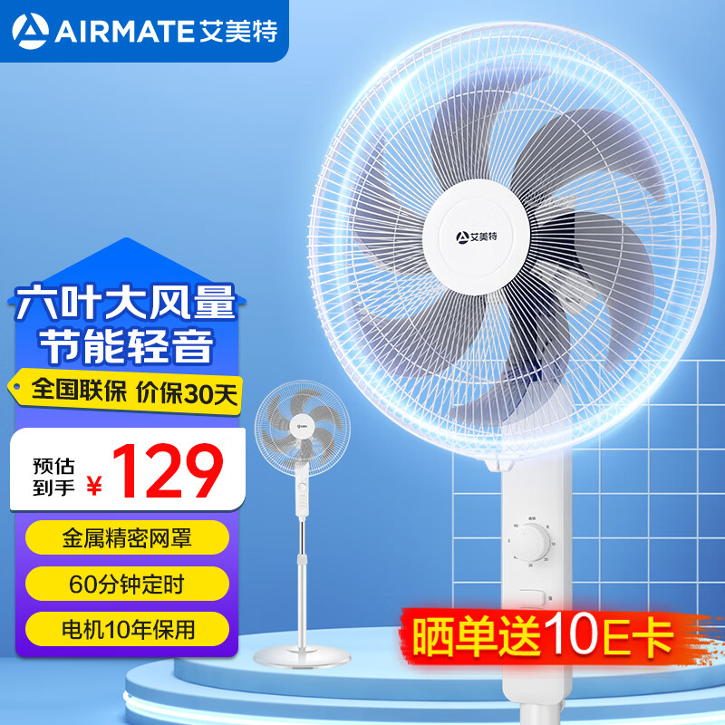艾美特电风扇落地扇家用六叶机械大风力风扇宿舍寝室立式定时摇头电扇节能低噪风扇 升级六叶皓月白