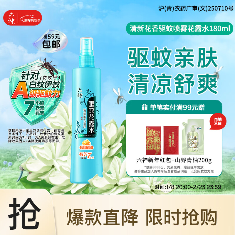 六神清新花香驱蚊喷雾180ml 基孔肯雅热 驱蚊酯 花露水驱蚊液防蚊水