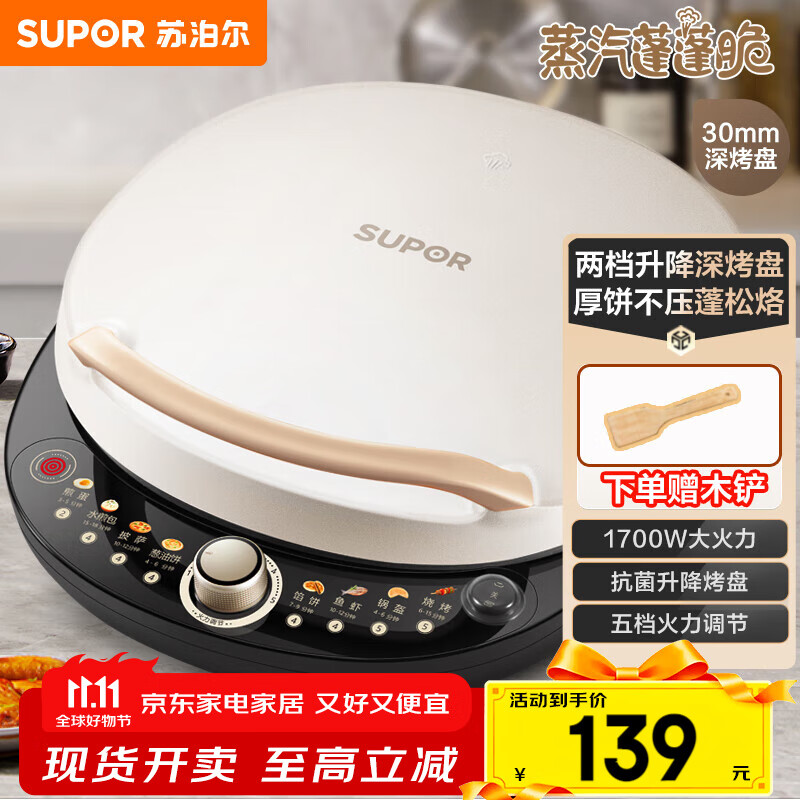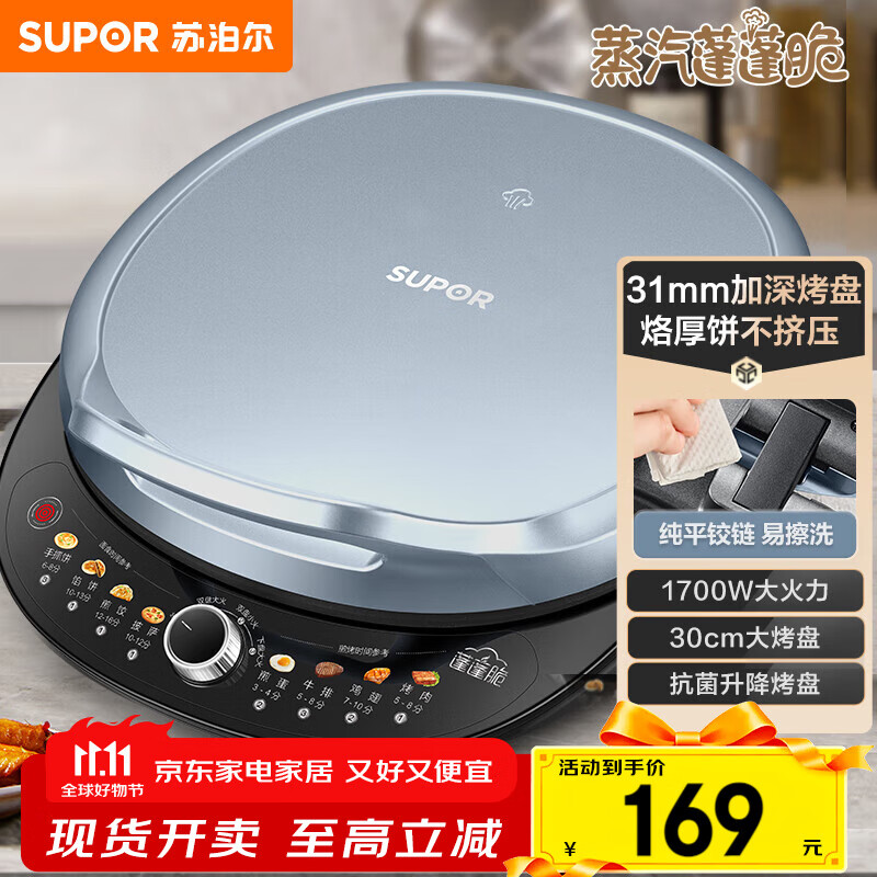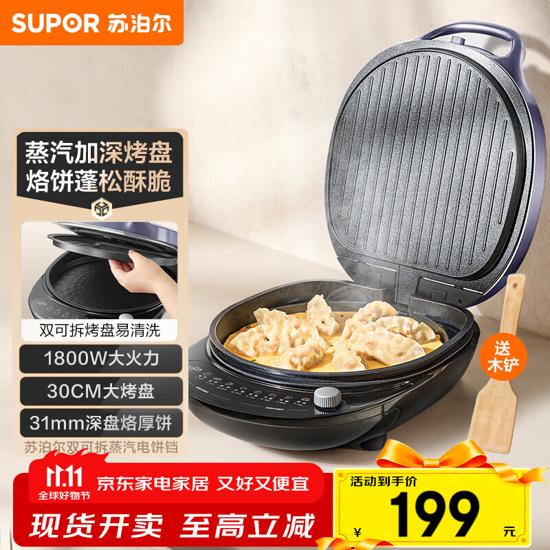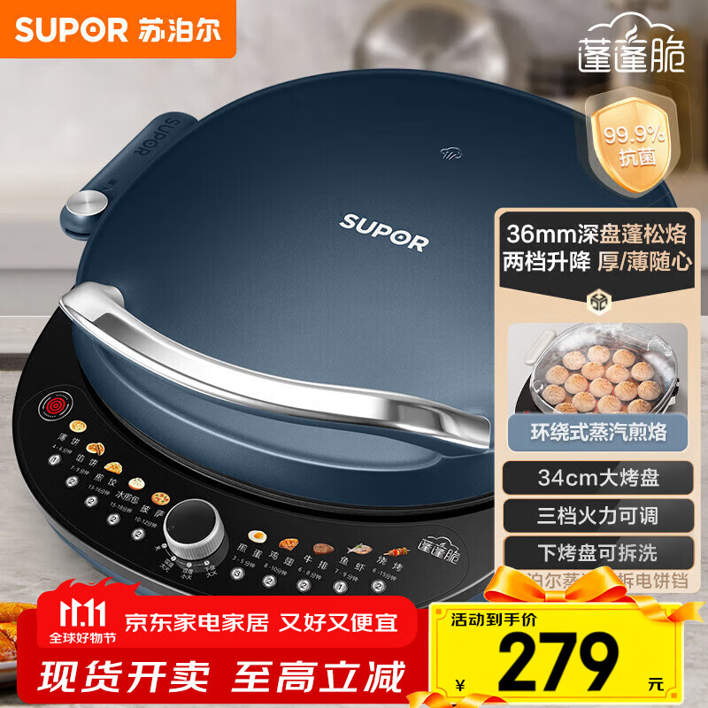 苏泊尔(SUPOR)电饼铛双面加热独立控温电饼档家用煎饼铛 升级加深加大烤盘早餐机 多功能不沾电饼锅春饼机烙饼锅 30CM大烤盘可升降JD30AQ849