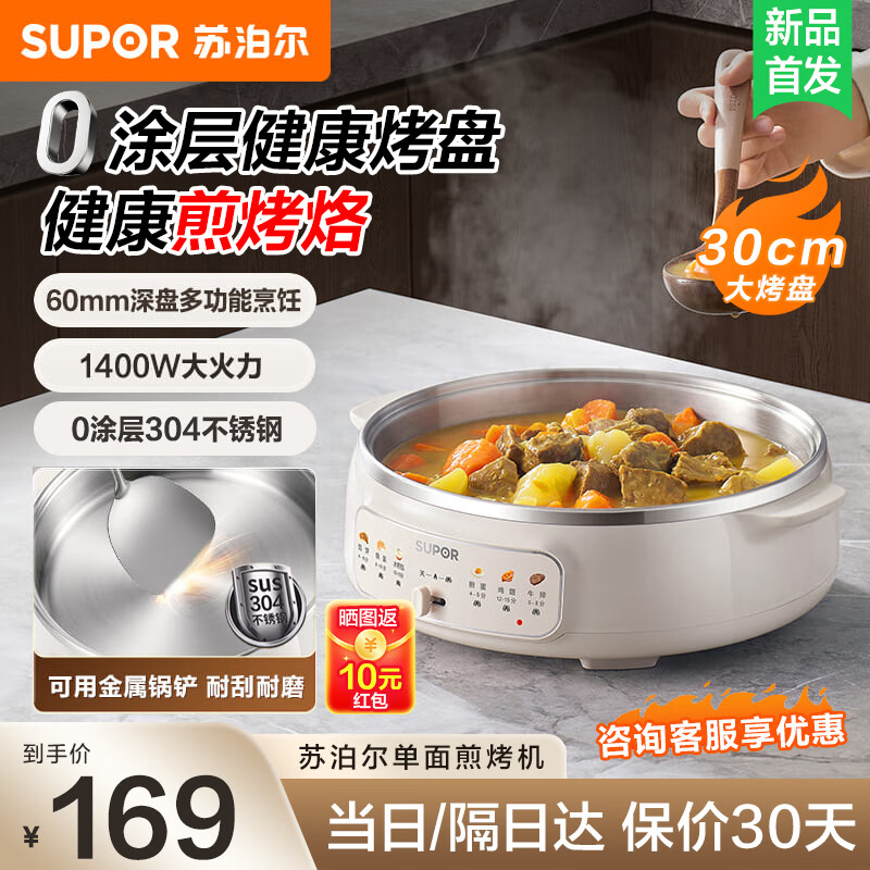 苏泊尔(SUPOR)电饼铛 0涂层 不锈钢电饼档家用 煎饼锅烤肉锅 烙饼锅早餐机煎烤机火锅煮锅 60mm加深 JT30A819