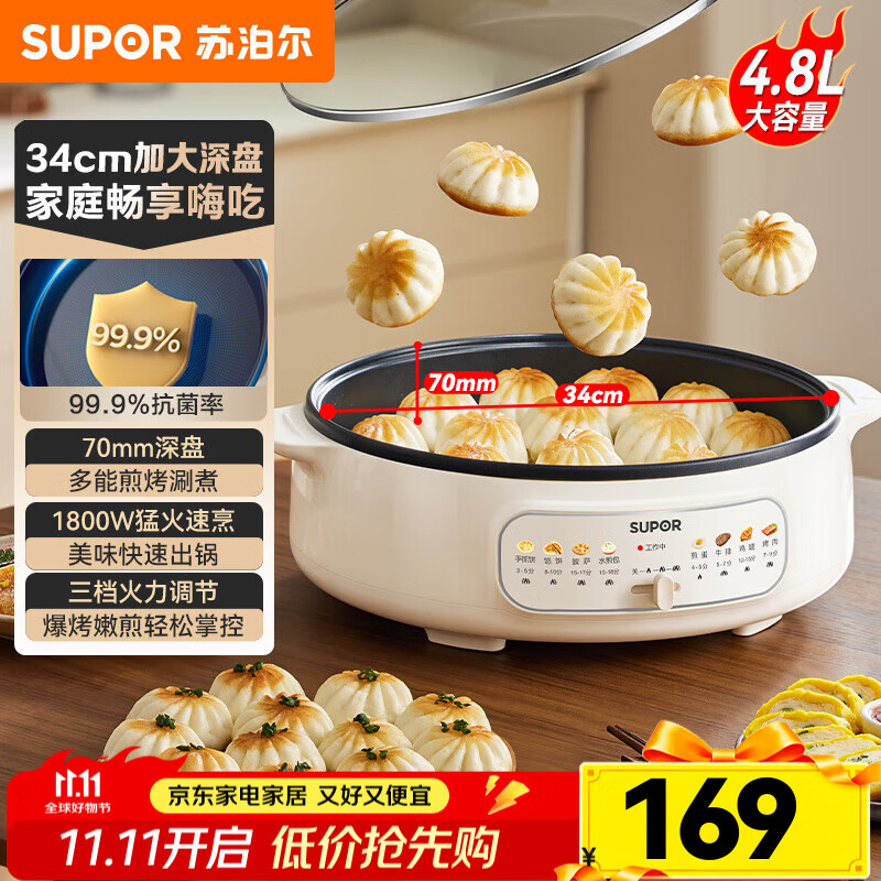 苏泊尔(SUPOR)4.8L大容量电饼铛 升级34cm加大加深煎烤机 70mm加深电饼烙饼锅 1800W大火力薄饼机 抗菌不粘烤盘 JT34A820