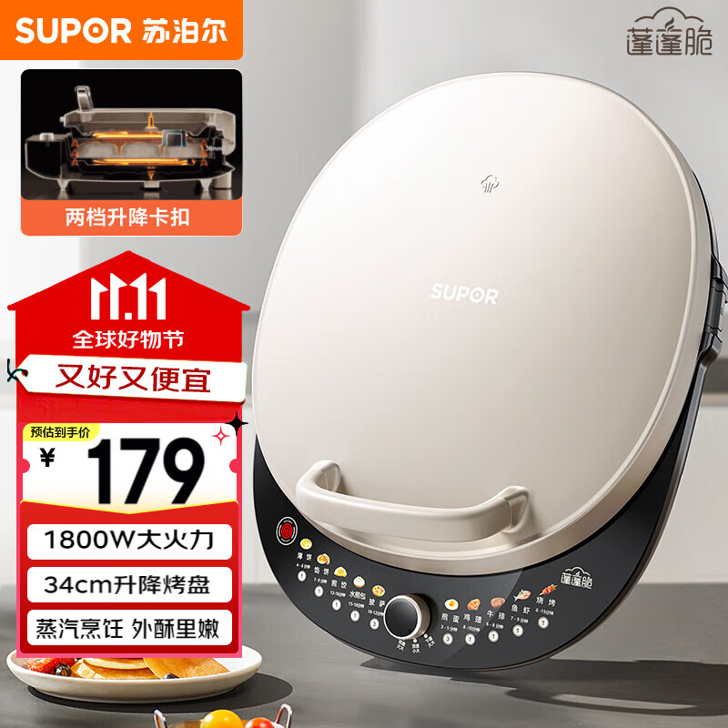 苏泊尔(SUPOR)电饼铛家用 双面加热 煎烤机烙饼锅煎饼铛36mm加深34cm加大升降烤盘 早餐机电饼档 JT34AQ876