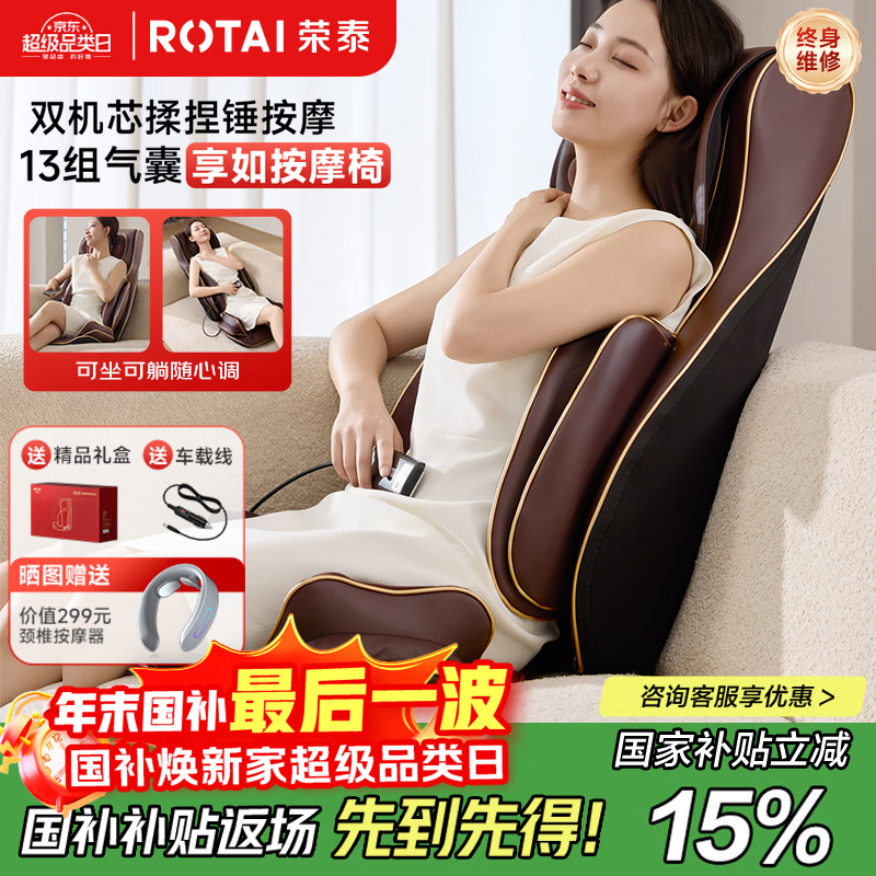荣泰按摩靠垫全身多功能按摩椅家用办公室按摩垫颈椎腰部背部热敷RT2187送男女友父母生日圣诞节礼物