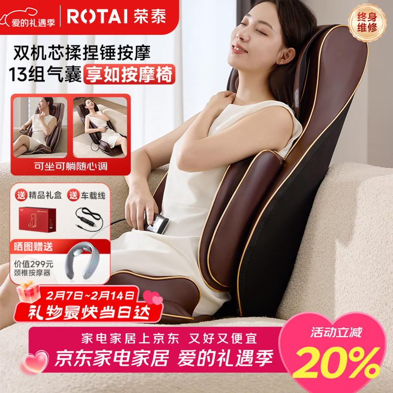 荣泰按摩靠垫全身多功能按摩椅家用按摩垫颈椎腰部背部热敷RT2187情人节送男女友父母生日礼物年货礼盒