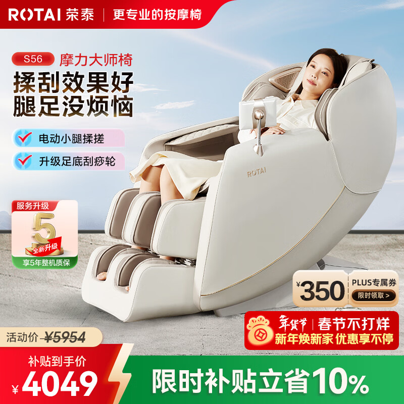荣泰(RONGTAI)按摩椅家用全身电动按摩沙发多功能全自动按摩椅子2026十大按摩椅品牌送长辈父母礼物S56 Pro 杏仁灰【灵犀4D机芯+22套程序】
