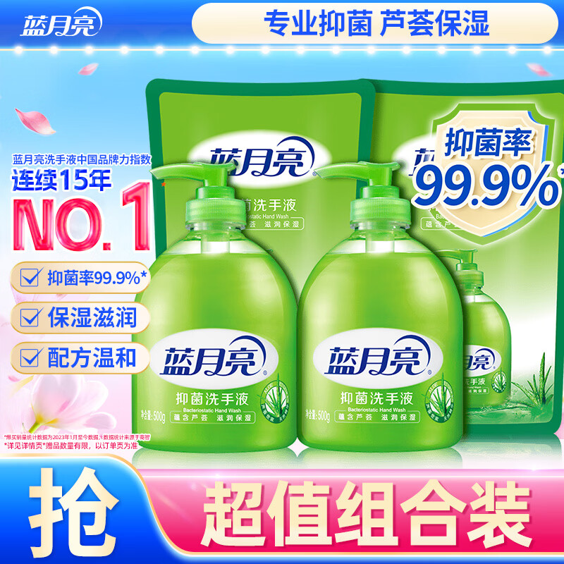蓝月亮洗手液泡沫丰富保湿芦荟抑菌99.9%500g*2瓶+洗手液补充装500g*2袋