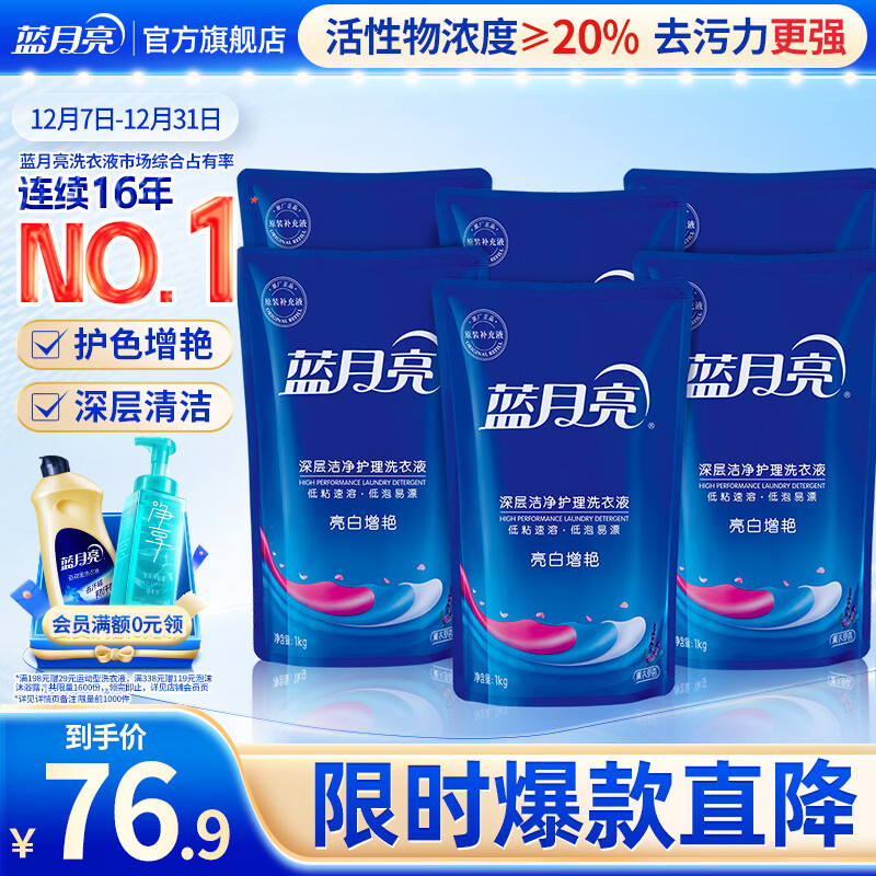 蓝月亮 亮白增艳洗衣液袋装(薰衣草香)1kg*6袋 强效去污 护色增艳