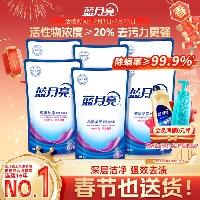 蓝月亮 深层洁净洗衣液 薰衣草香 1kg*6 袋装补充装 高效除螨 强效去污