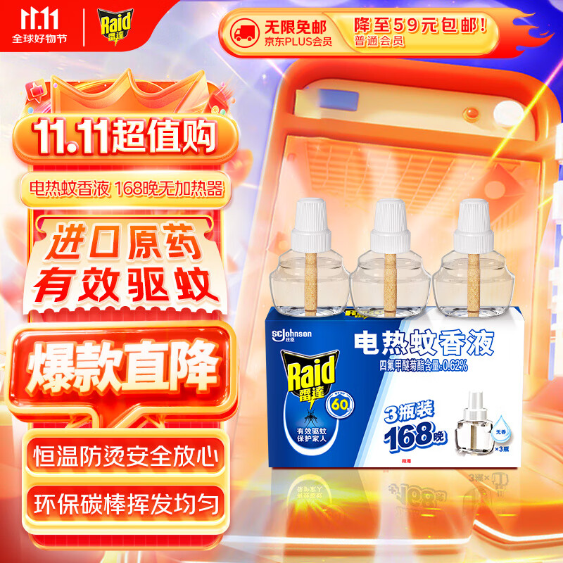 雷达(Raid)基孔肯雅热电蚊香液 168晚3瓶装 +无线加热器 无香型