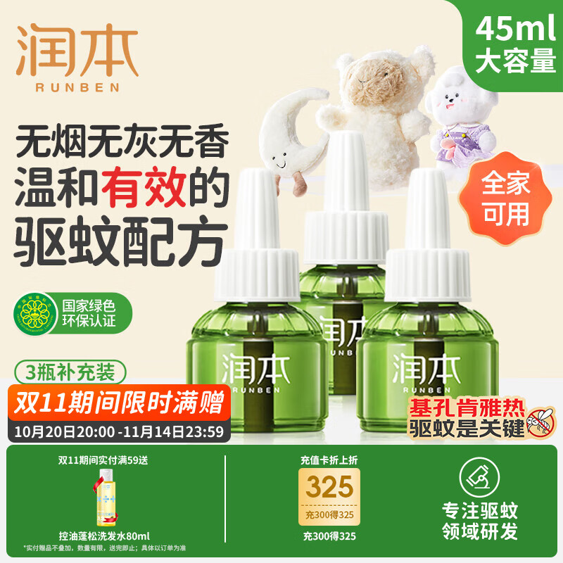 润本(RUNBEN)蚊香液电蚊香驱蚊液90晚45ml×3瓶补充装防蚊无香型