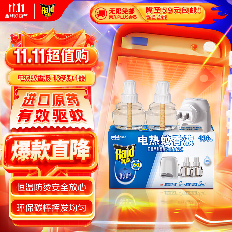 雷达(Raid)(Raid) 电蚊香液 136晚2瓶装+无线加热器 无香型 防蚊液