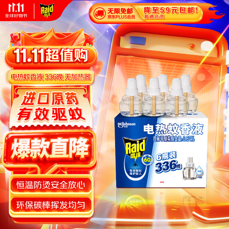 雷达(Raid)基孔肯雅热电蚊香液 336晚6瓶装替换装 无加热器 无香型 驱蚊器