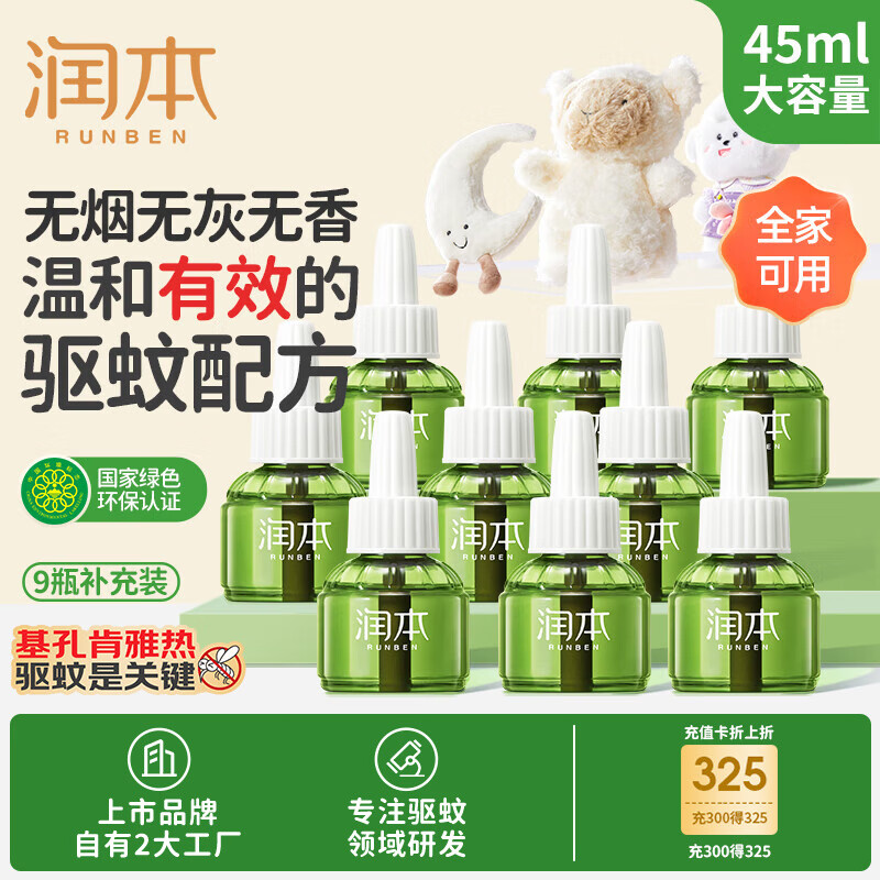 润本(RUNBEN)电热蚊香液蚊香驱蚊液45ml×9瓶补充装无香型