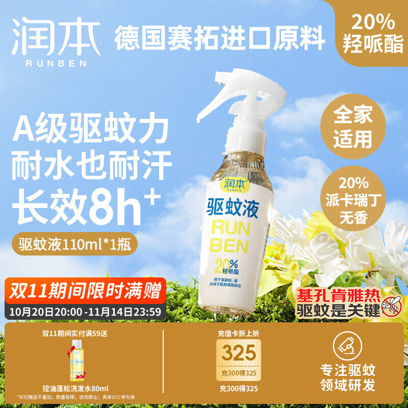 润本(RUNBEN)驱蚊液驱蚊喷雾110ml花露水蚊香液防蚊虫叮咬驱蚊20%派卡瑞丁无香