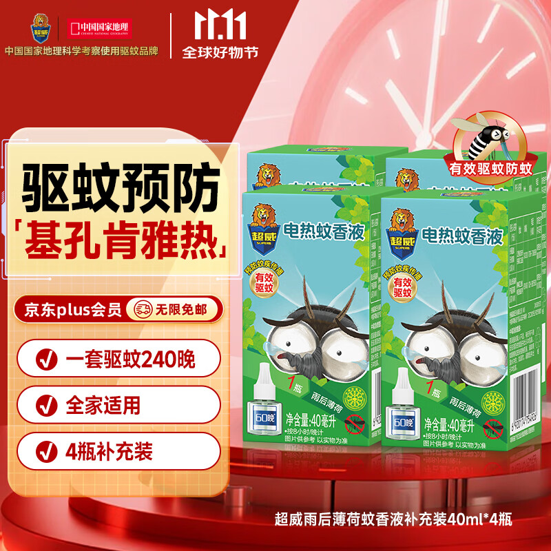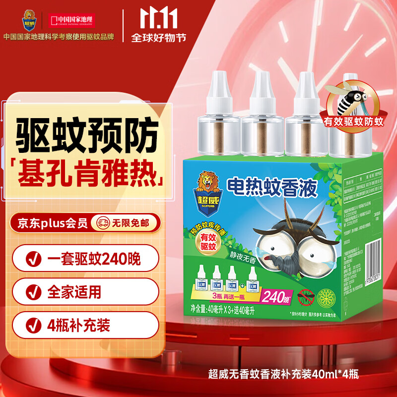 超威电蚊香液基孔肯雅热家用非无香驱蚊液防蚊液补充液4瓶无加热器
