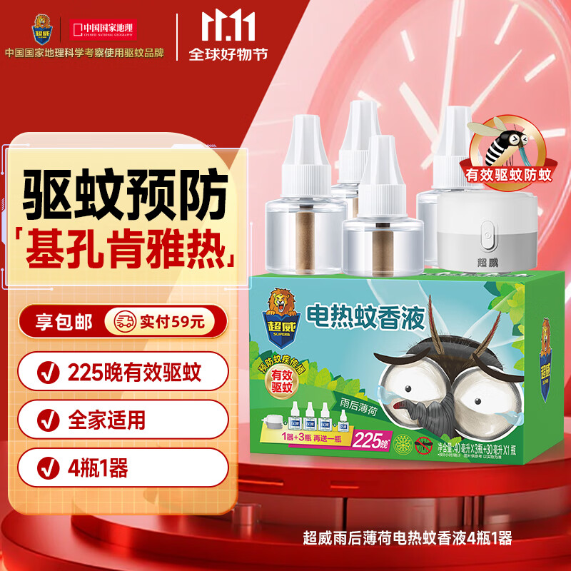 超威电热蚊香液基孔肯雅热灭蚊器非无香驱蚊液防蚊液补充液4瓶1加热器